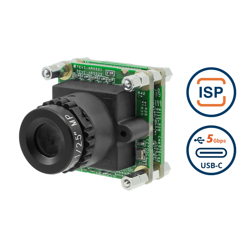 USB3 Type-C PCB Board Level Camera with onsemi AR0522 5MP Mono Rolling Shutter with Onboard ISP + 34 Degree M12 Lens with IR-Cut Filter